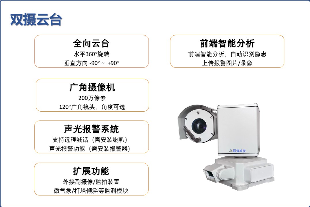 · 采用工业级高清单侧双目摄像机及云台三个摄像机一体化设计;